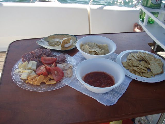 Meals on board are always a nice time to just sit back, relax, and enjoy the sail or scenery. One of our favorite boat snacks (it’s a meal really) is crackers with cheese and salami. It’s quick and easy, creates hardly any dishes, and the “consumer” can get creative in decorating their crackers. Add a variety of yummy mustards or dips to make each bite unique!