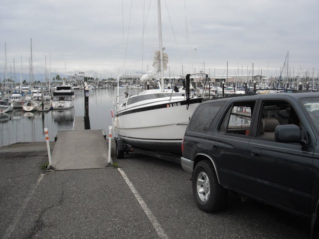 We got to Squalicum Harbor in Bellingham just before midnight, parked in the trailer lot, and went to sleep in our cozy aft berth. The new curtains really came in handy in the well-lit parking lot. In the morning we got some quick coffee and breakfast at that famous Seattle coffee shop and started getting the boat ready to launch. I was below organizing the items we had just brought in from the truck while Captain Mike was getting ready to raise the mast when I heard him exclaim: “OH NO!”. So I popped my head out and after quickly analyzing the situation realized our biggest mistake to date: We had left the jib and its furling system hanging on the garage ceiling. So much for my detailed checklists… It’s a long drive to Bellingham so going home to pick it up was out of the question. We had to come to terms with the fact that we would not be doing much sailing on this trip. We used the line to lift the mast as a fore-stay and added an extra line for safety. We weren’t about to lose another mast, but that’s another story….