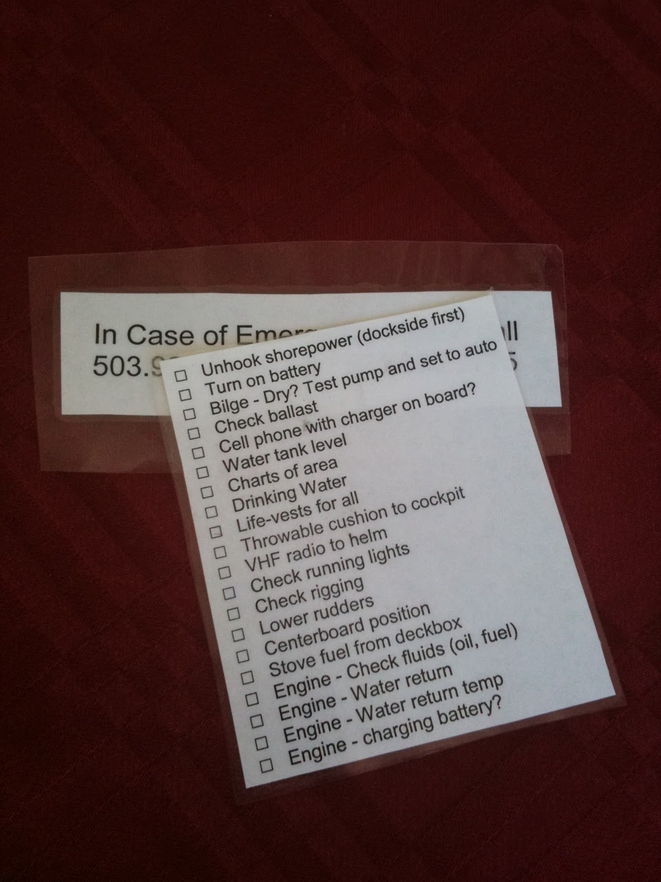 | “Laminated” emergency card and pre-departure checklist aboard Webfoot |