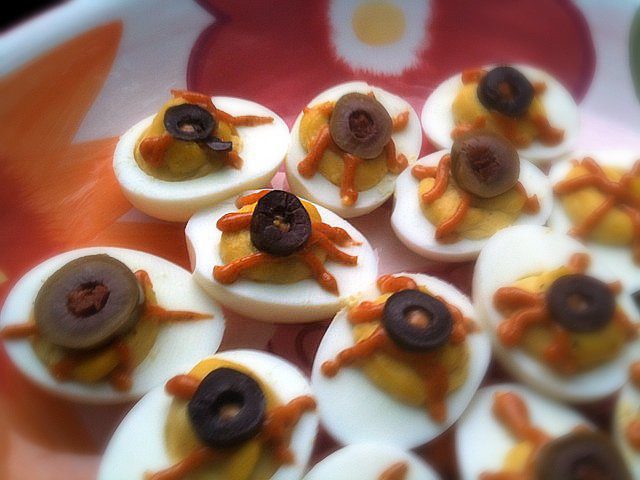 Last night I made these “Deviled Eyeballs” I saw on GalleySwap for a Halloween potluck lunch we had at work today. They were a hit!