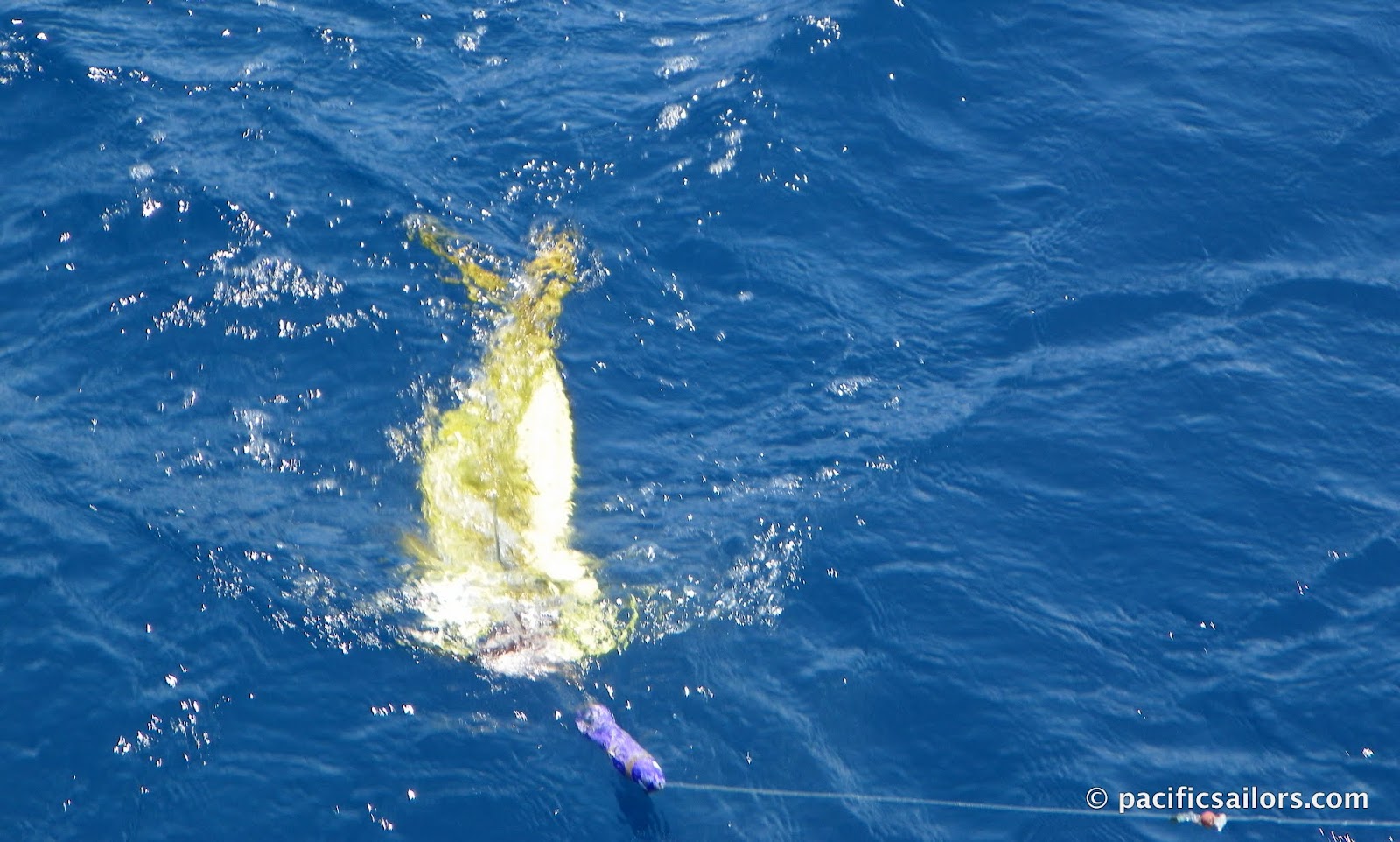Occasionally, we also check the fishing line that always trails our boat. Most times it seems to repulse any fish in the area, but not this morning! I yelled down to Mike that we had a fish on the line, slowed the boat, and started reeling it in. When I saw a bright yellow flash, I knew right away it was a dorado. We’d be eating well tonight! As soon as Mike heard me say “dorado,” he was up on deck with the camera, ready to document the occasion. As I got the beautiful fish close to the boat, Mike took a couple of photos, and then the fish had one big burst of energy and shook himself free of the hook. So much for fresh ceviche and fish tacos….
