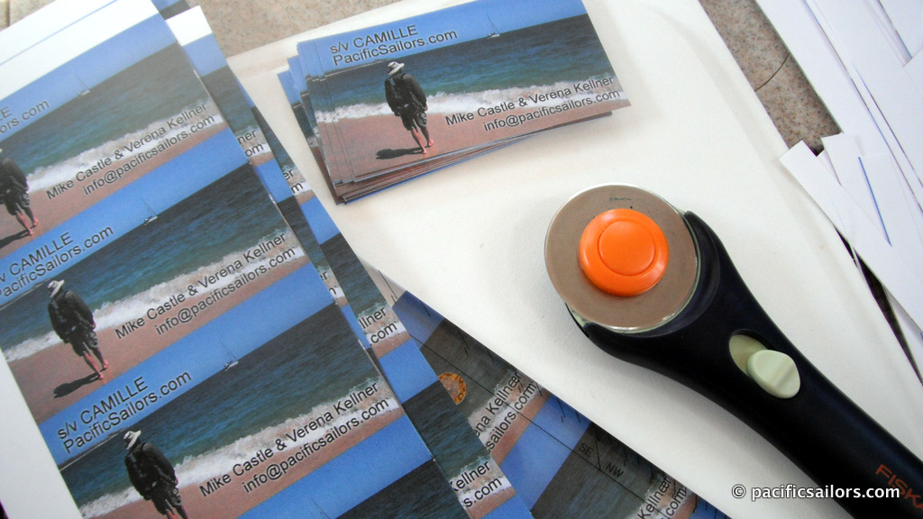 We’ve seen several boats that tout their blog address in big letters on their boom. Others wear hats and shirts emblazoned with their boat name and website. We stand out enough with our terrible language skills so we try keep to our boat and ourselves from looking like a walking advertisement. Currently we carry one piece of boat swag: Boat cards. And to save money we make them ourselves (see our DIY recommendations).