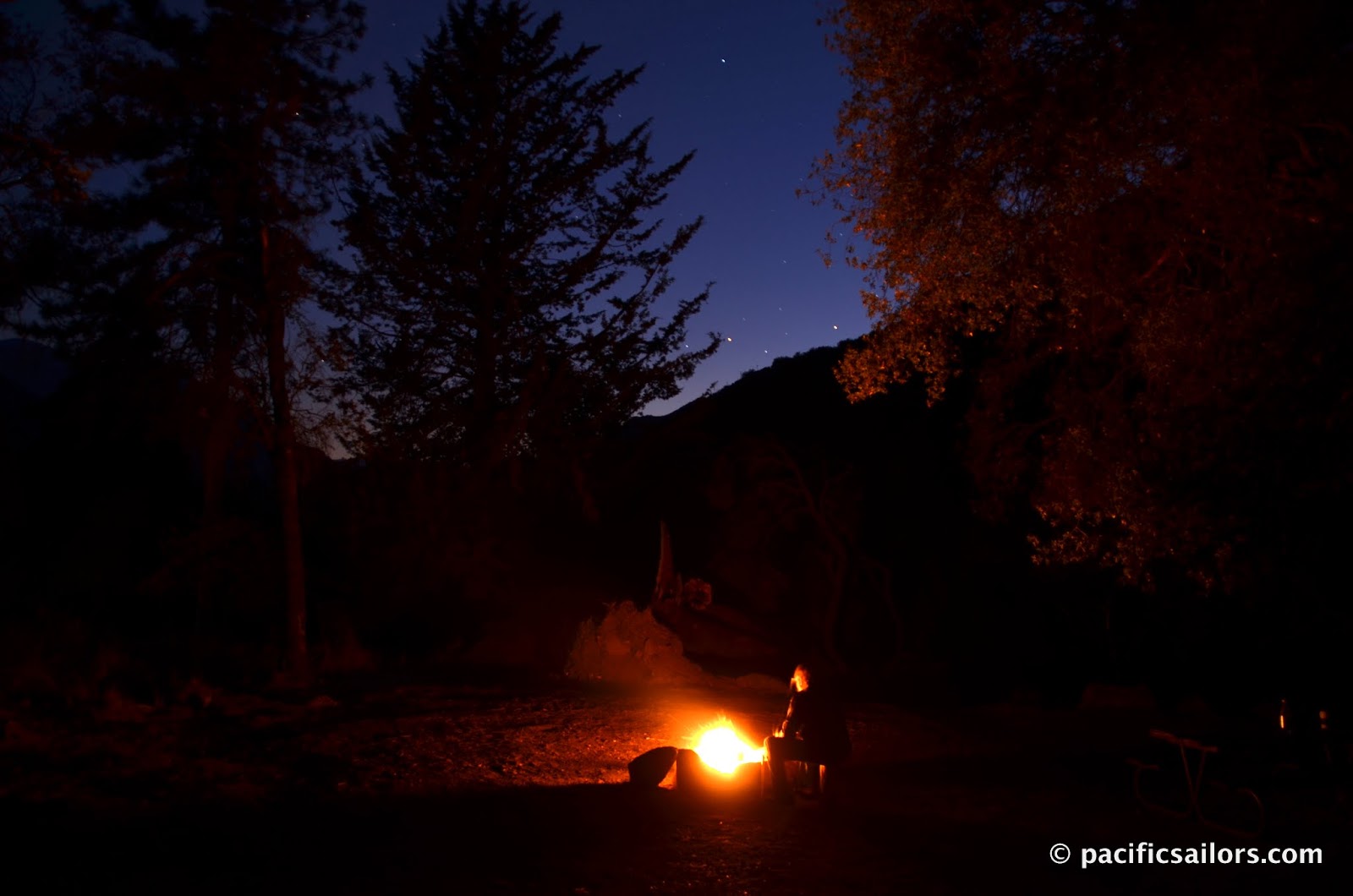 Camp fire under a starry sky in Kings Canyon National Park
