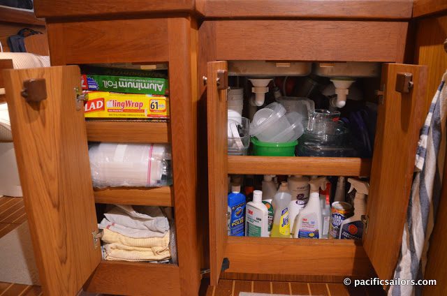 Update November 4: After getting a lot of comments regarding the size of my under sink cabinet I’m adding a photo. Top shelf is pyrex and plastic storage containers, bottom shelf contains cleaning products. Underneath is even more space which is filled with canned food and also accessible through a floor board. Behind the cabinet on the left is a large cabinet for a regular size garbage can, which is accessible from above and the side. Love my galley!