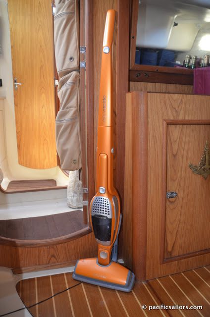 When we lived on land we had a vacuum to keep the carpet clean and a big mop-like sweeper to keep hardwood floors clean. But what to do on a small boat with not much floor space and varying availability of electricity? You buy smaller versions of the same items – either rechargeable or 12 volt – the best is to have both!