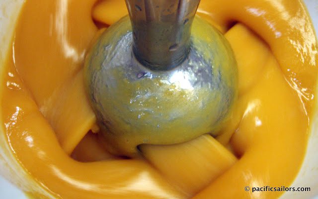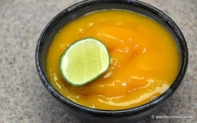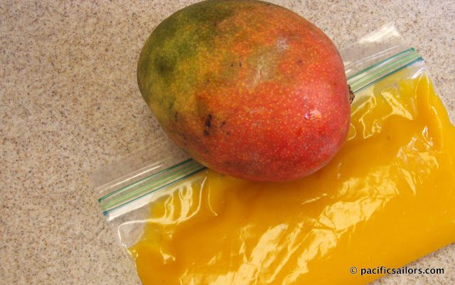 Sorbet is a super-easy and fun treat to make on a boat. Pretty much any fruit can be used. Raspberry-Banana is always a winner, as is Banana with some chunks of dark chocolate. Here I use fresh mangos.
