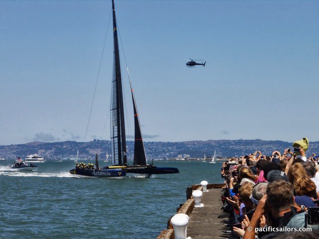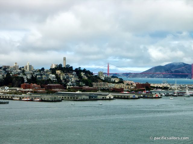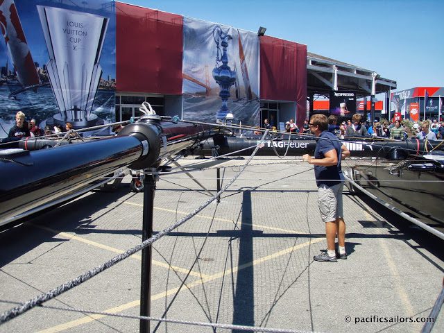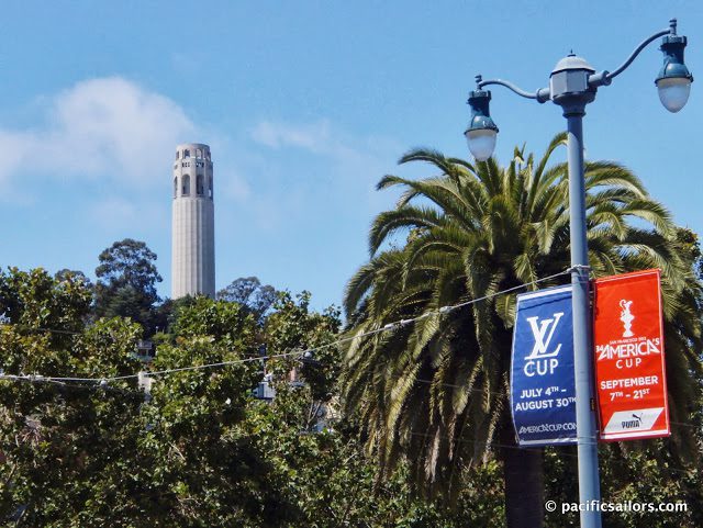 We just returned from a 5-day trip up to San Francisco to see the America’s Cup boats. Right now is the Louis Vuitton Cup, the races that decide who goes to the America’s Cup which starts in September. Long gone is the big helm to stand behind – these boats are steered with the push of a botton and are so fast the sailors have to wear helmets.