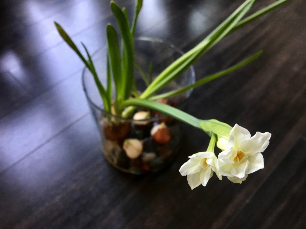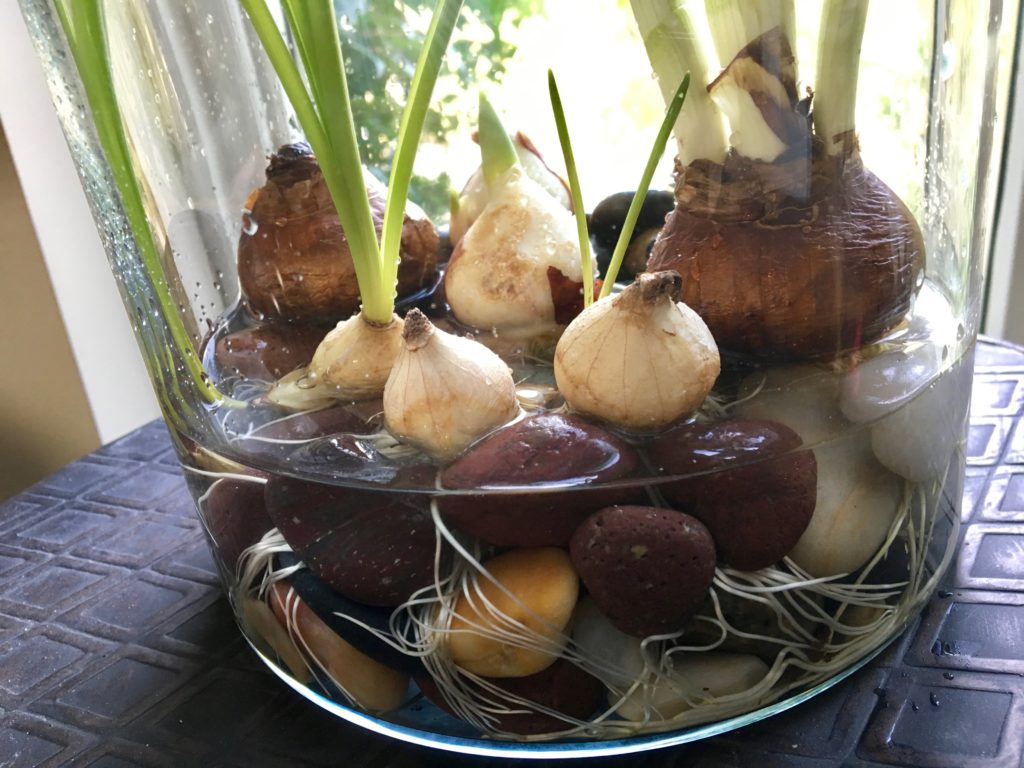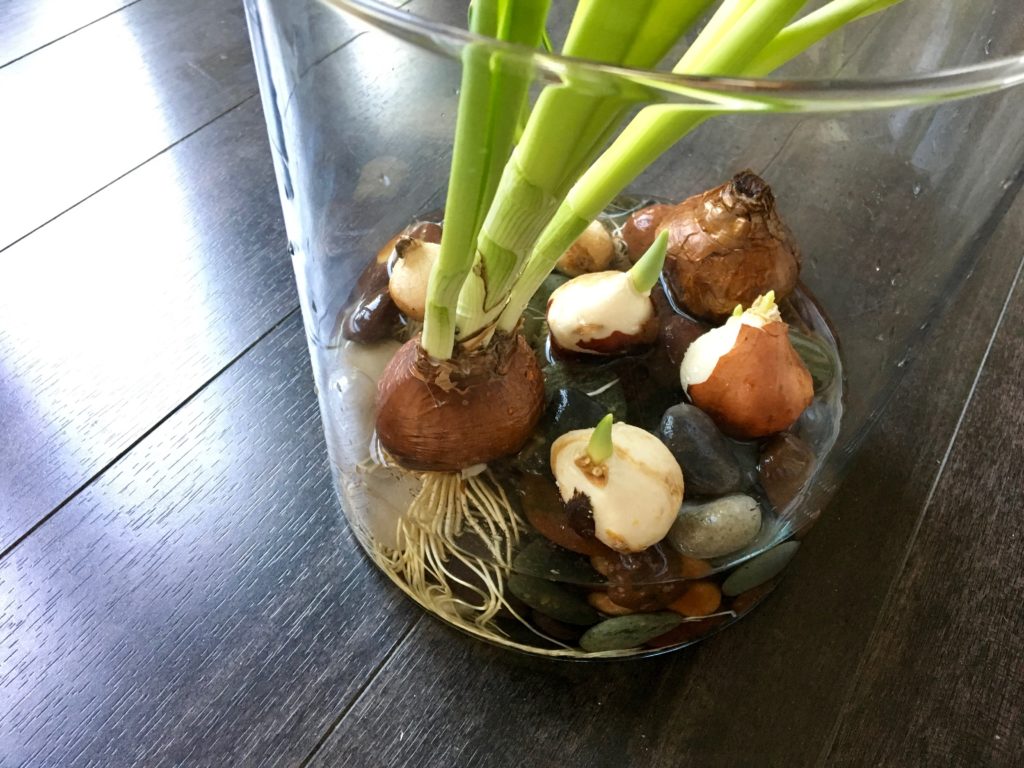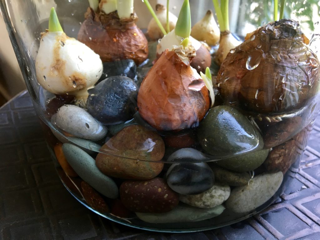 - Place a variety of flower bulbs into the rocks (we used Paperwhites, tulips and muscari)
