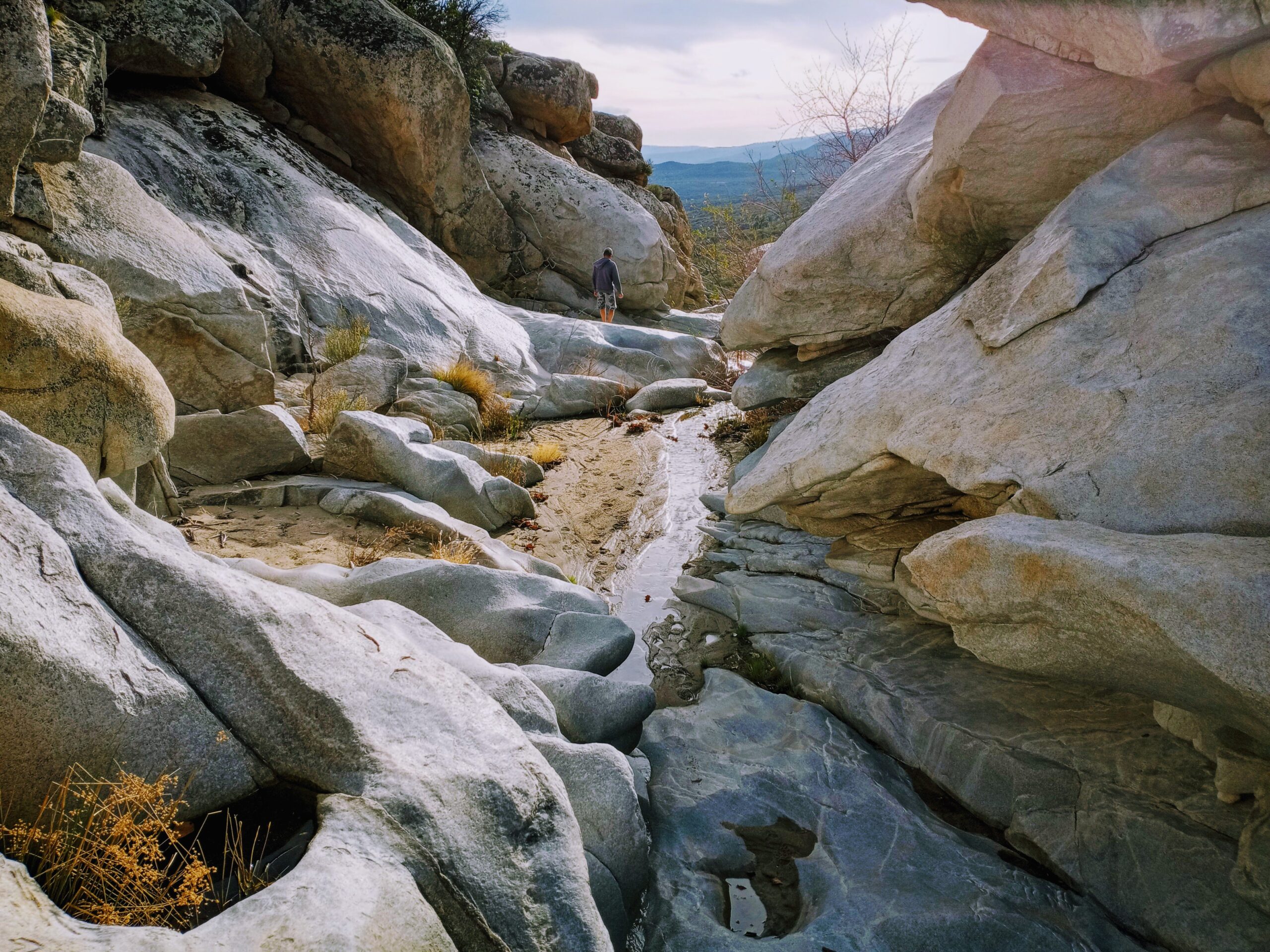 We parked along the national forest road and rode our bikes until the bike batteries were near 50%. Then we hiked down a mostly dry creek bed until the dropoff became too steep.