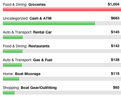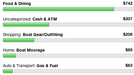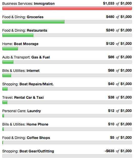 We actually did some real cruising this month instead of just taking care of stuff. It’s amazing how much there is always to do when we don’t even work. Right now we are on the hard getting the bottom painted but that expense will show in June. This month we had the added expense of updating our immigration papers for the next three years (after that we can become permanent residents and no longer have to pay). We actually have a positive number in the Boat Gear category this month! Kind of… Mike’s cousin returned our bad battery to West Marine and we got our money back. Of course, we bought a new battery in April so it evens out. Also had to buy our annual fishing licenses ($100) and had a diver clean the bottom ($40). If it wasn’t for some thousand-dollar expense every month we’d be well within our budget!